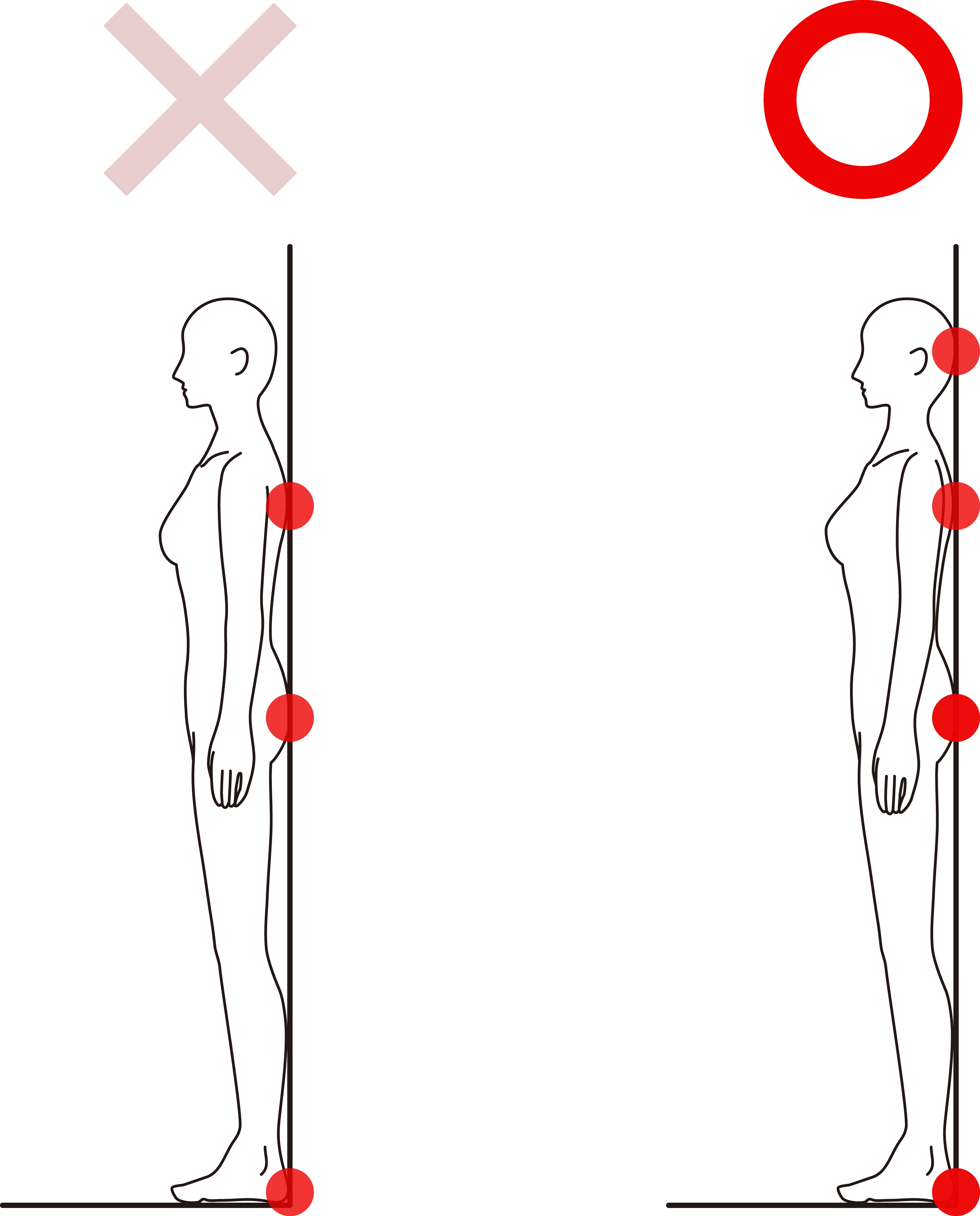 壁に背中を向けて立ち、かかと、お尻、肩、後頭部をつけて、腰は手のひら1枚が入るのが良い姿勢です。